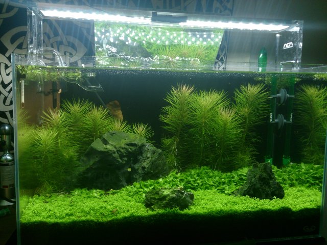 Hier mal ein aktuelles Bild, ich hab ein paar Stengel von den limnophila sessiliflora vom 30er Becken eingepflanzt. Sieht einfach harmonischer aus, und ein paar schnellwachsende Pflanzen schaden nicht