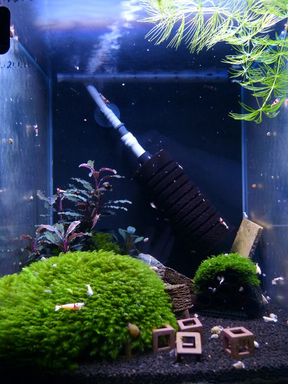 Betrieben wird alles mit aufgesalztem, reinem Osmosewasser, zum Aufsalzen nehme ich bei den kleinen Becken Salty Shrimp GH+ und im 84er GH/KH+. Gefiltert wird mit Außenfiltern, Soil ist ADA Amazonia bzw. Environmental Soil und im 84er schwarzer Gümmersand. Im 84er leben auch noch einige Corydoras (Weitzmanis und Green Stripes) und vietnamesische Kardinäle, außerdem noch 4 verbliebene Rorata-Guppymännchen aus einem früheren Stamm, den ich irgendwann mal abgegeben habe. Dabei sind die 4 als Jungtiere übrig geblieben, habe sie schlicht übersehen... alles Jungs