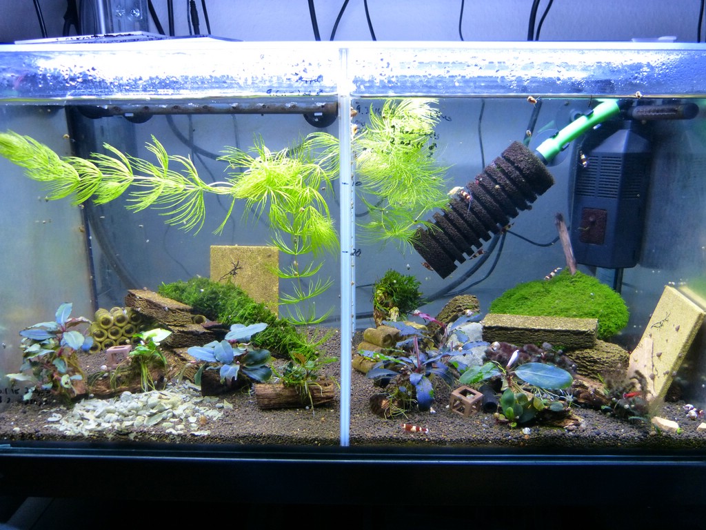 Betrieben wird alles mit aufgesalztem, reinem Osmosewasser, zum Aufsalzen nehme ich bei den kleinen Becken Salty Shrimp GH+ und im 84er GH/KH+. Gefiltert wird mit Außenfiltern, Soil ist ADA Amazonia bzw. Environmental Soil und im 84er schwarzer Gümmersand. Im 84er leben auch noch einige Corydoras (Weitzmanis und Green Stripes) und vietnamesische Kardinäle, außerdem noch 4 verbliebene Rorata-Guppymännchen aus einem früheren Stamm, den ich irgendwann mal abgegeben habe. Dabei sind die 4 als Jungtiere übrig geblieben, habe sie schlicht übersehen... alles Jungs