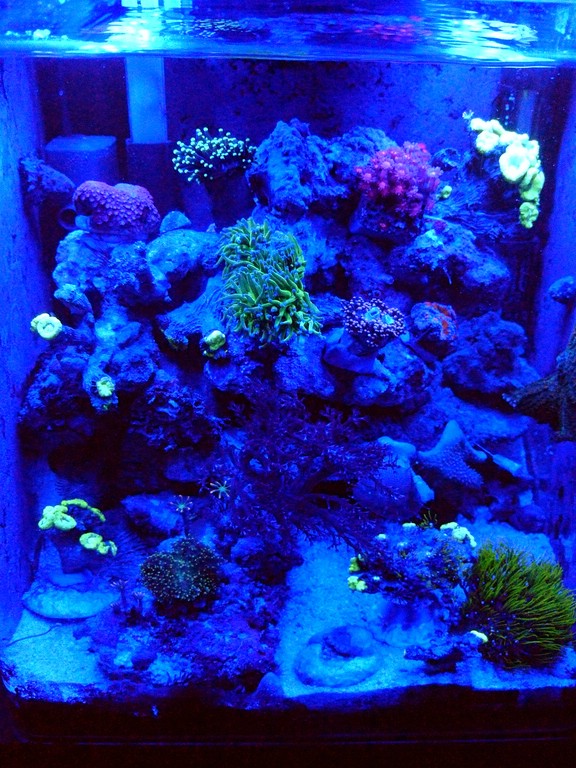 Da die normale Beleuchtung langweilig ist, habe ich für die Abendstunden aus blauen Autotuner-LED-Strips eine aktinische Beleuchtung gebastelt, die die Korallen nun schön fluoreszieren lässt in den letzten beiden Beleuchtungsstunden. Habe das leider noch nicht auf Foto bekommen, muss da erst noch mit dem Weißabgleich und der Belichtung herumspielen.