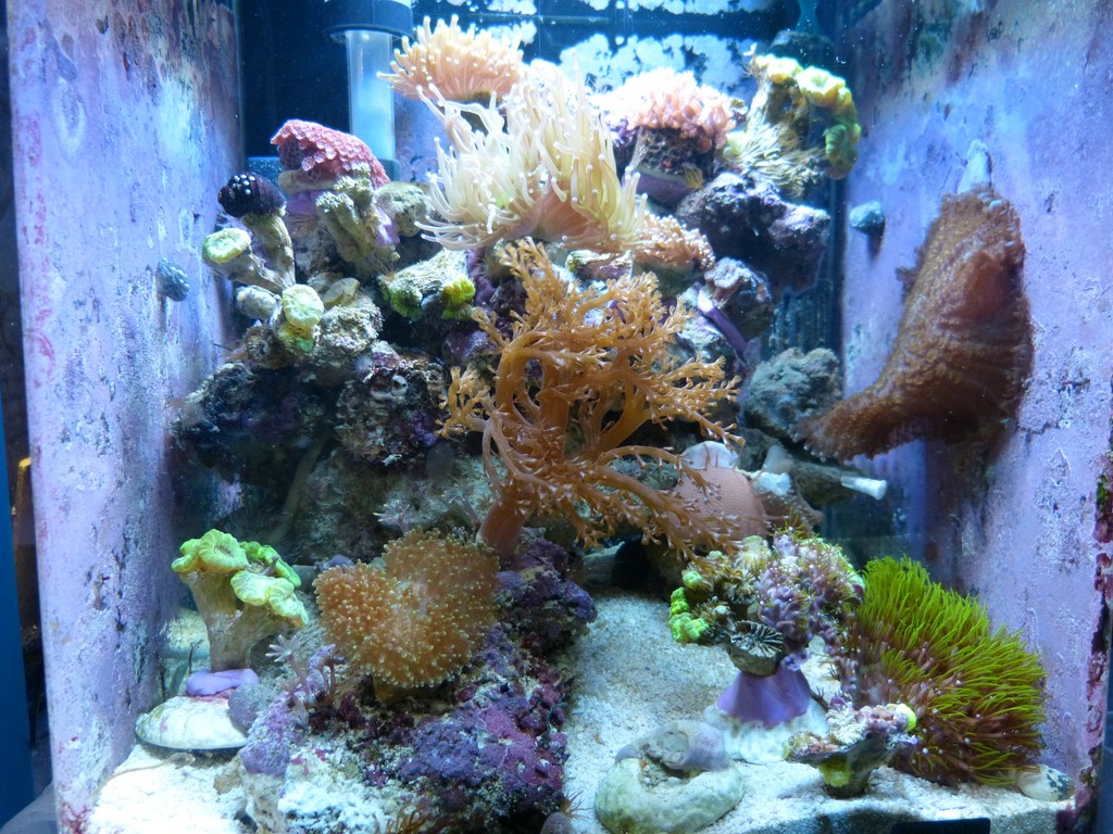 Die Ersteinrichtung erfolgte mit 4kg Lebendgestein und Livesand von Mrutzek, außerdem dem mitgelieferten Dennerle-Sand. Dazu Drahtlagen, Weichkorallen, Einsiedler, Schnecken... das übliche halt. Im Laufe der Zeit kamen dann Thor amboinensis, Xenien, Scheibenanemonen, Zooanthus-Krusten, Knopias, Briareum... zwischendurch auch mal hier und da eine LPS, die sich aber meist wegen zu weniger Nährstoffe (dank Drahtalgen) und vor allem wegen des Wachstumsdrucks der anderen "Wucher"-Arten nicht lange hielten. Nur eine gelbe Caulastrea hielt tapfer bis heute durch.