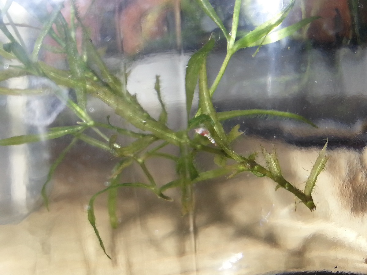 In meiner Lieferung befanden sich auch drei blinde Passagiere. Als ich das Moos reinigen wollte (mach ich immer) fand ich drei Garnelenbabys. Nach kurzem Blick mit der Lupe wußte ich, dass ist NICHT GUT. Denn die Tieren waren für mein Wasser nicht geeignet und schon gar nicht für pures LW. Schnell nahm ich ein sauberes Glas, etwas Nixkraut rein und Wasser aus meinem LW Becken für die C. babaulti (GH 10, KH 9 und PH 7,2) und setzte die drei mal rein. Leider kann und konnte ich nicht mehr tun. Und kurz darauf schwammen und krabbelten die 3 ohne Transportfärbung im Glas herum. :happy:
