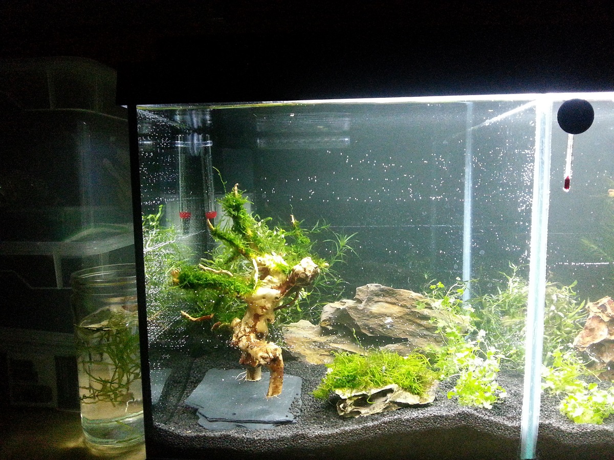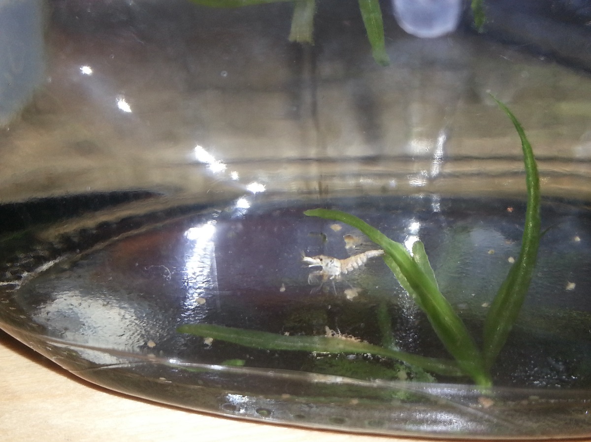 In meiner Lieferung befanden sich auch drei blinde Passagiere. Als ich das Moos reinigen wollte (mach ich immer) fand ich drei Garnelenbabys. Nach kurzem Blick mit der Lupe wußte ich, dass ist NICHT GUT. Denn die Tieren waren für mein Wasser nicht geeignet und schon gar nicht für pures LW. Schnell nahm ich ein sauberes Glas, etwas Nixkraut rein und Wasser aus meinem LW Becken für die C. babaulti (GH 10, KH 9 und PH 7,2) und setzte die drei mal rein. Leider kann und konnte ich nicht mehr tun. Und kurz darauf schwammen und krabbelten die 3 ohne Transportfärbung im Glas herum. :happy: