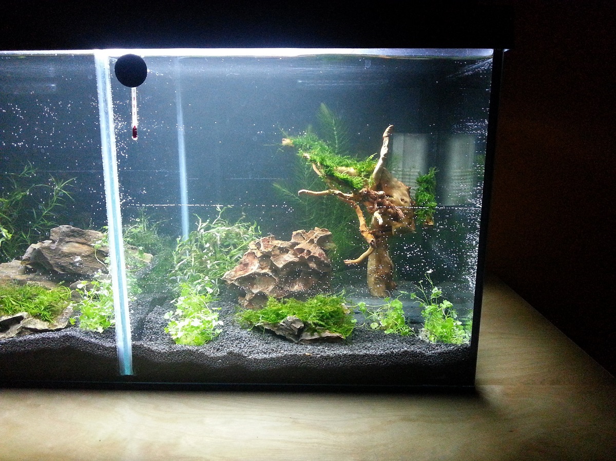 ich möchte hier gerne mein heute geflutetes 60er vorstellen. Das Becken wurde vom Glaser mittels einer Scheibe in der Mitte getrennt. Da es nur Neocardina (Sakura Red und Yellow fire Neon) beherbergen wird, wurden mit schwarzen Quarzkies von Dennerle ohne Bodendünger bestückt.