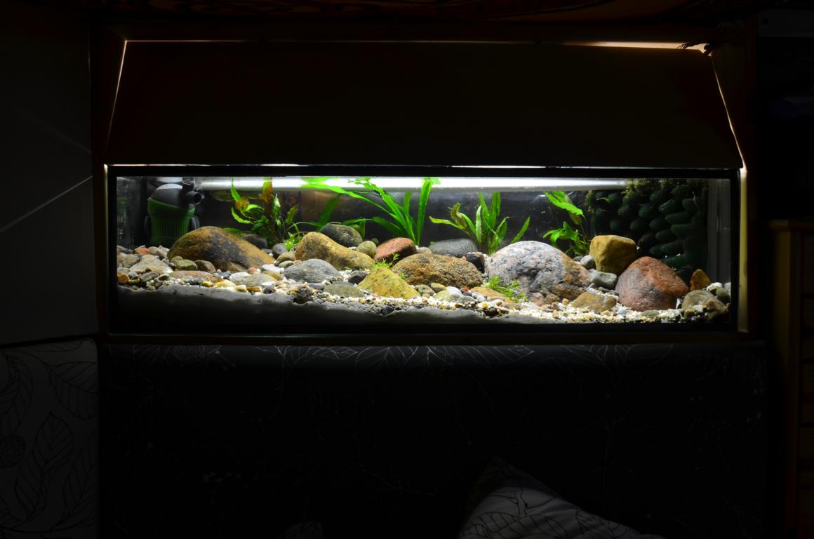 Momentan tummelt sich noch ein Trupp Tigergarnelen in dem Aquarium, die könnten aber ggf. auch umziehen.