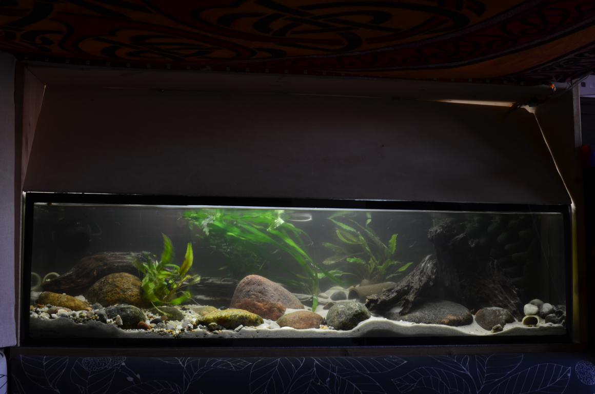 Momentan tummelt sich noch ein Trupp Tigergarnelen in dem Aquarium, die könnten aber ggf. auch umziehen.