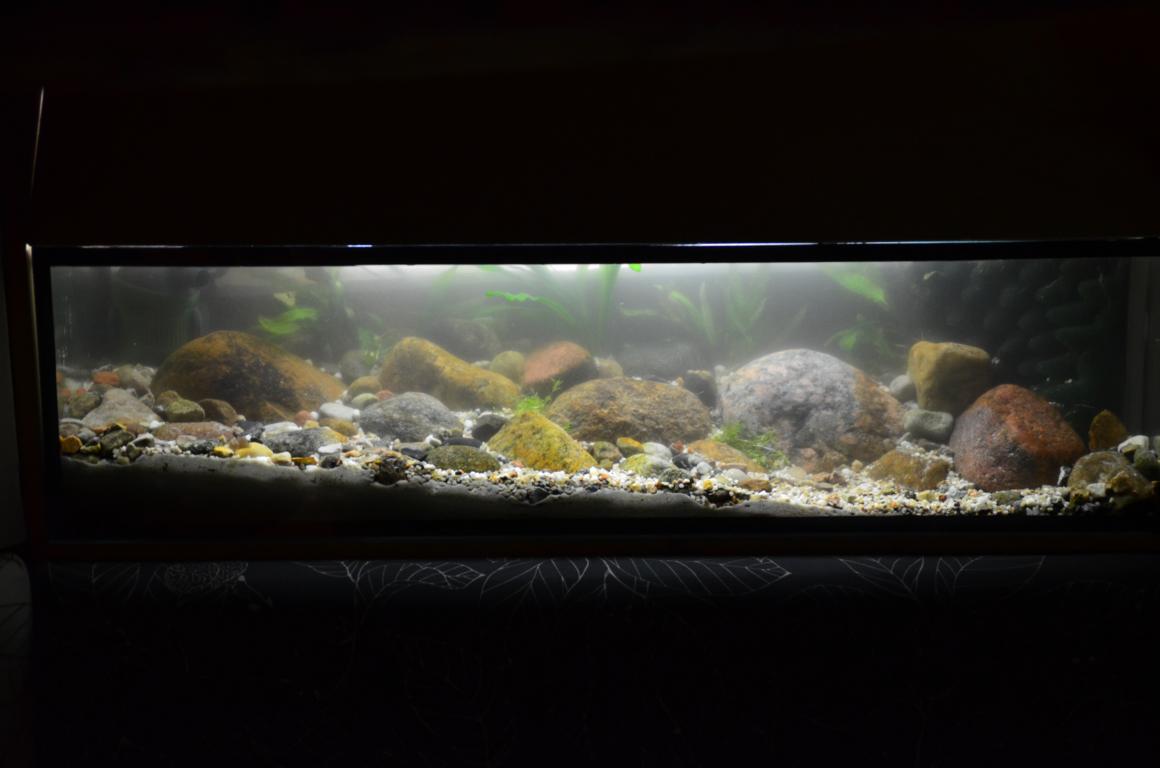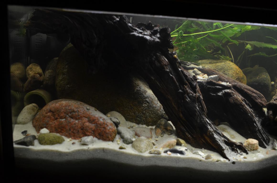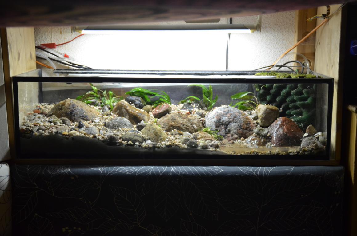 Momentan tummelt sich noch ein Trupp Tigergarnelen in dem Aquarium, die könnten aber ggf. auch umziehen.