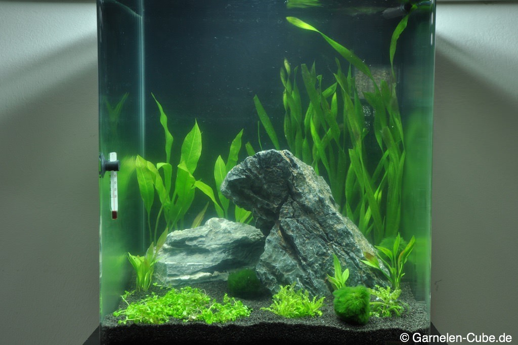 Die drei Aegagropila linnaei lagen in den ersten Tagen noch in Kugelform im Becken. Ich habe sie dann später mit an die Steine gebunden. Ich bin gespannt, ob sie langfristig den Stein mehr und mehr überwuchern. Aegagropila linnaei sollen ja langsam wachsen, das wird also dauern