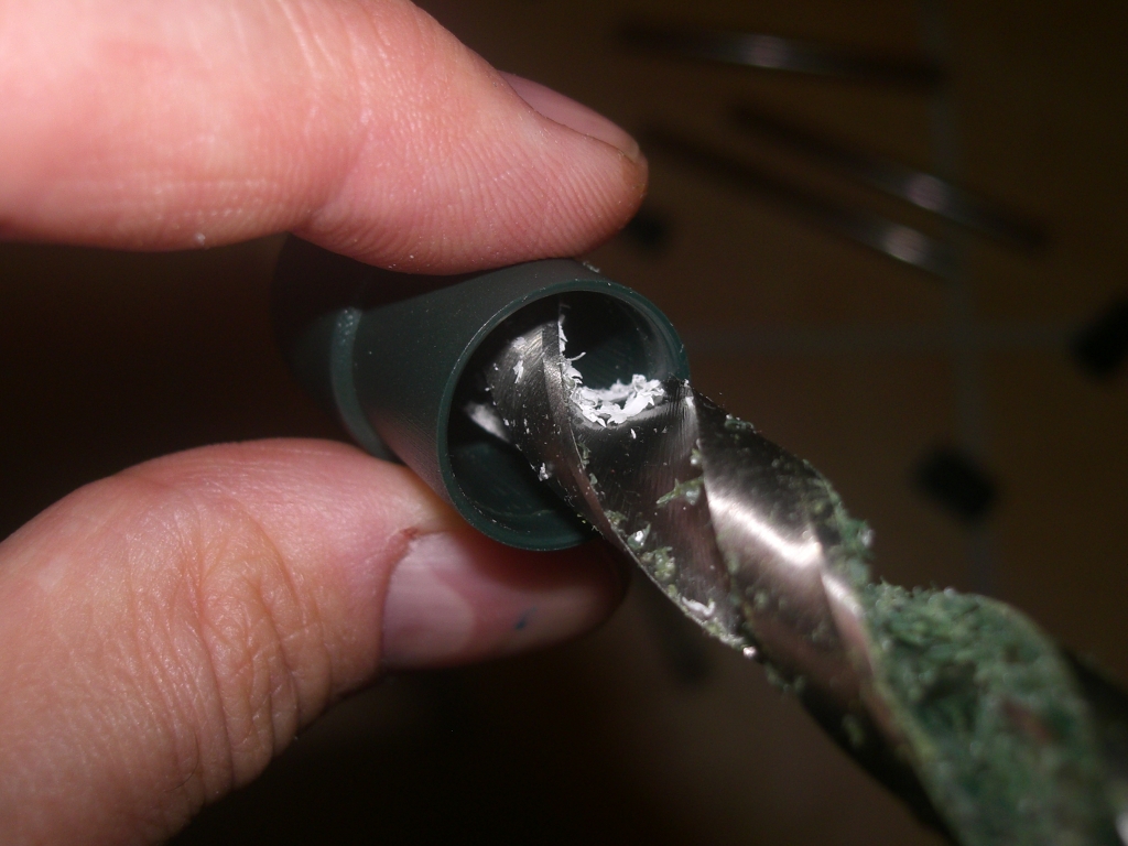 Der Anschlag lässt sich mit einem scharfkantigen Bohrer (Holz, Stahl oder HSS) oder einer feinen Rundfeile entfernen.