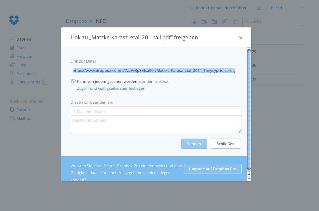 Was tun? Es gibt viele Möglichkeiten so etwas zu transferieren, eine davon ist DropBox. Es ist ein Dienst der privat oder auch geschäftlich genutzt werden kann um Anderen Daten zur Verfügung zu stellen. Einfach per download über den gewohnten Browser oder man kann damit die eigenen Daten auf mehreren seiner Geräte synchronisieren.