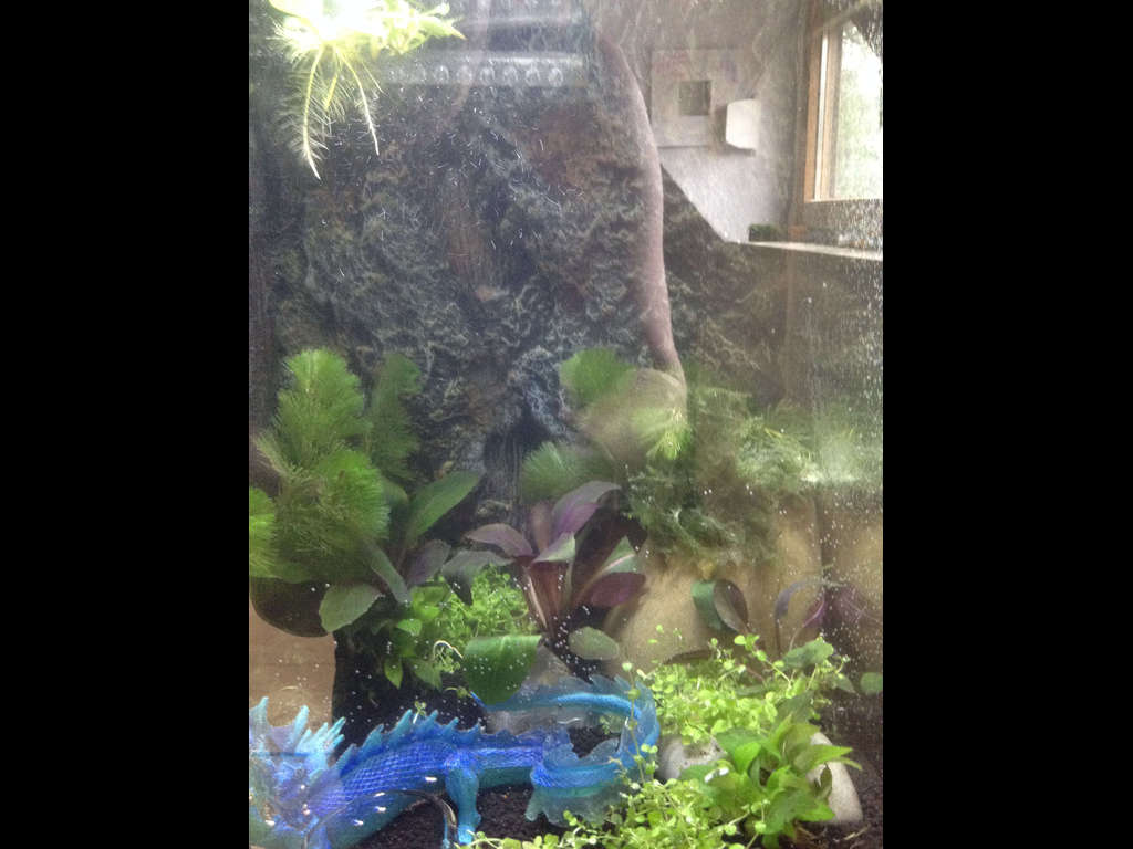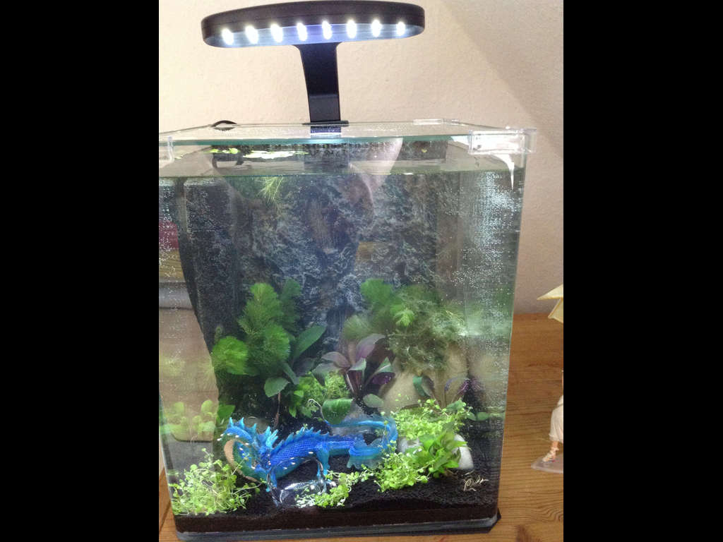 Sie ist eine rechte Leseratte und liest sich zur Zeit durch die Eragon Reihe von Christofer Paolini. Daher habe ich ihr einen Wasserdrachen ins Aqua gesetzt. Ich hoffe jetzt nur das er nichts giftiges absetzt, wobei Kinderspielzeug von Schleich als unbedenklich galt. Nun ja vorerst gefällt es uns ganz gut. Das Kit hat ja alles was man braucht außer Pflanzen und Tiere.