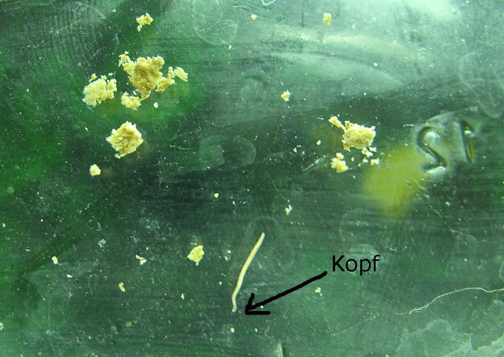 Bei der zweiten Art wird es wesentlich schwieriger. Sie ist wesentlich dünner als die erste Art, kann dafür etwas länger werden. Sie ist auch weiß bis durchsichtig. Auch hier habe ich mir ein Tier unterm Mikroskop angesehen und bemerkt, dass es ein gelben, kringelschwanz-förmigen Darm hat. Unterm Mikroskop habe ich auch gesehen, dass der Körper nicht so weiß ist wie er mit bloßem Auge betrachtet scheint. Ich meine mir einzubilden, dass man kleine schwarze und graue Punkte sehen kann. Außerdem scheint er noch so etwas wie eine Art Kopf zu haben, dieser ist aber eher rund.