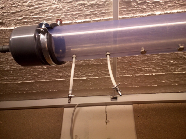Der Wasserverteiler besteht aus einem verklebten 90mm PVC Rohr und ist glaub ich ca 1m lang und bietet momentan 9 Anschlüsse plus Entlüftung. Natürlich in Klarsichtrohr die Show muss halt Stimmen ;)