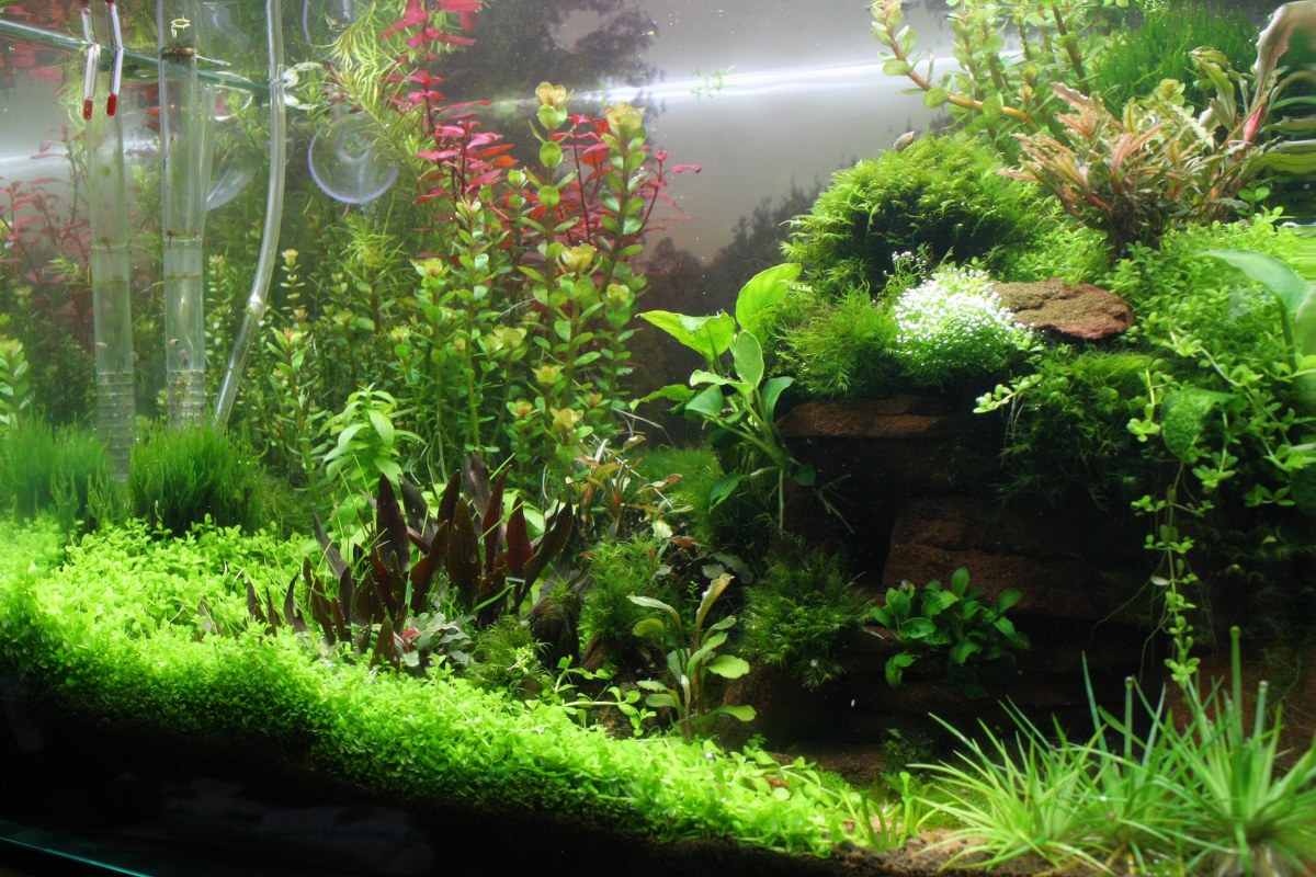 Zwischenzeitliche Bakterienblüte wegen zu heftigem Schnitt und gleichzeitigem Entfernen mehrerer Pflanzen. Da musste dann mal ein UVC dran für einige Zeit (deshalb auch der unförmige Filterein- und -auslauf)