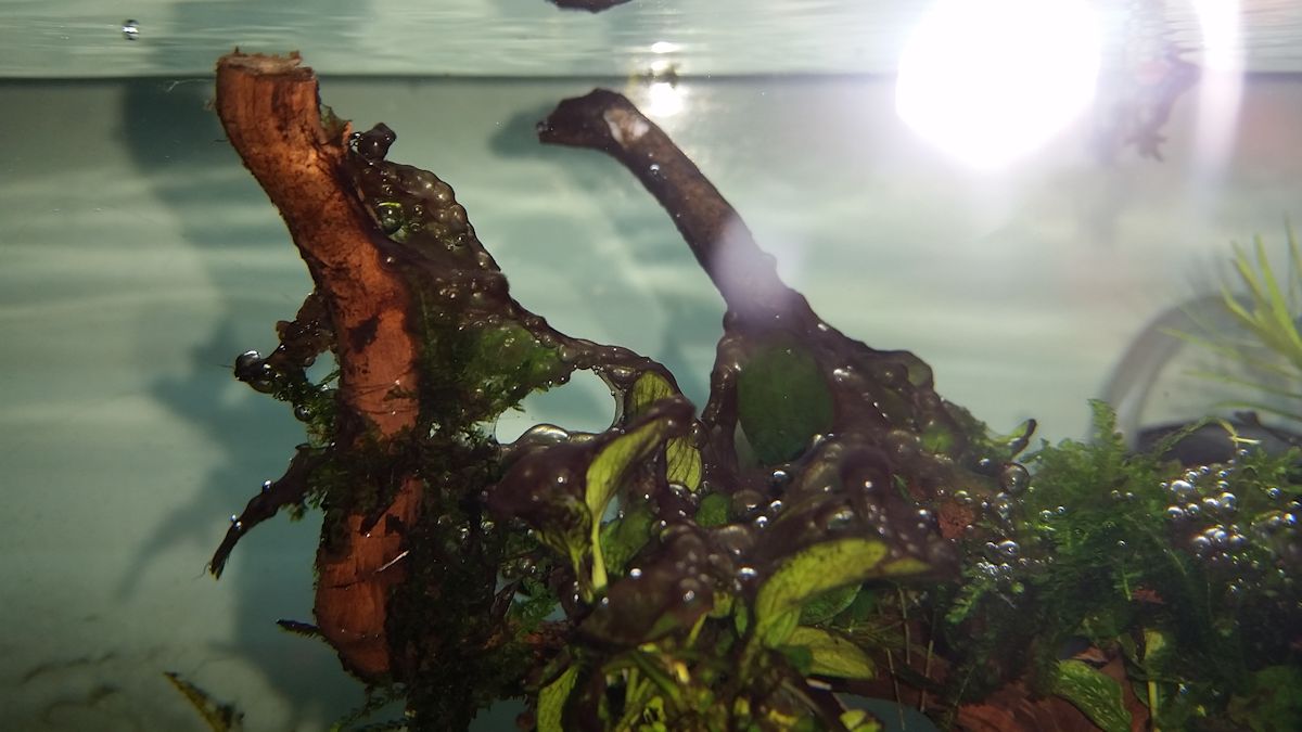 Die Kieselalgen sind auf dem Rückmarsch. Was das braune Zeug auf der Wurzel und den Moosen ist, hab ich noch nicht rausgefunden. Bakterienrasen ist ja normalerweise weiß. Meins sieht genauso aus ist aber graubraun.