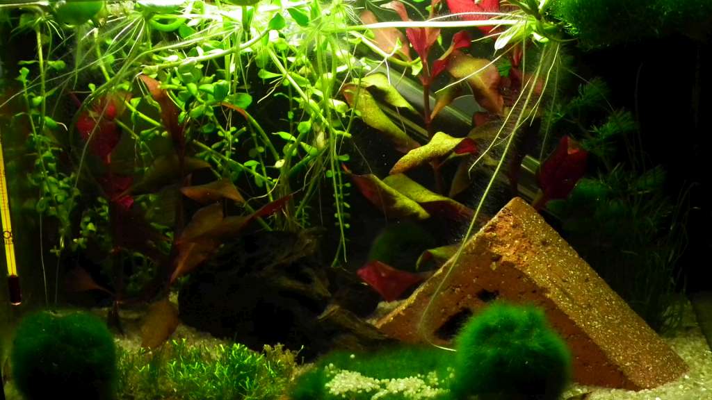 Ok, ich wollte das 20er nämlich sowieso ausmisten. Da die Libellenlarven scheinbar alle knallroten Red Fire verspeist haben (ein paar blassere sind noch da) und eine Menge Fadenalgen das Becken zuspinnen (oder sind das auswüchse der Mooskugeln?) Muss da mal wieder klarschiff gemacht werden.