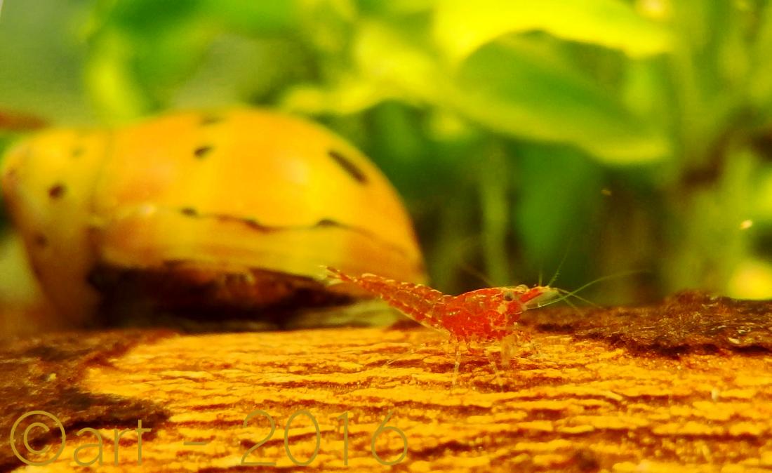 nach langer Zeit wieder einmal hier. Hatte vor einigen Tagen die seltene Gelegenheit in einem der besseren Aquarienläden die letzten drei Garnelen zu kaufen, die unter der genauen Angabe 'rote Garnele' liefen. Nun haben sie sich gehäutet, ihre Scheu verloren und wirken munter und wohl auf, und - das wichtige daran! - sie lassen sich fotografieren! Rot sind sie (auch) und ich gehe davon aus, daß es roten Rückenstrichgarnelen sind.