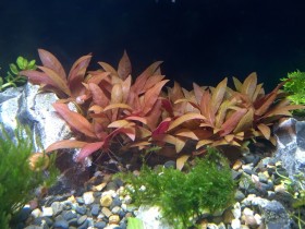 Ach ja... Thema Fadenalgen: Unglaublich wie schnell die auftauchen, aber auch wieder verschwinden. Das war jetzt das zweite Mal, dass die Biester von heute auf morgen komplett verschwunden waren. Man kann nur noch erahnen, dass das Becken vor zwei Tagen noch komplett grün war! Selbst meine Alternanthera reineckii mini steht wieder prächtig im Saft!