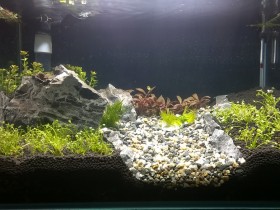 Alles halb so wild... Nach 24 Stunden sieht es dann so aus:Bis auf die Lücke zur rechten nicht so verkehrt wie ich finde. Ein wenig Technik ist auch eingezogen, wobei der Miniheizstab zur Linken wohl nicht bleiben wird. Als CO2 Quelle dient aktuell noch der gute alte Tortenguss, der mir laut Dauertest auch mehr als 20mg/l ins Becken bringt. Das sollte fürs erste reichen. Die bisherigen Pflanzen sind von Tropica alle als "medium" eingestuft, also 6-14mg/l. Das sollte der Tortenguss eine Weile halten können. :thumbup: Wenn jemand eine Idee hat was ich auf der rechten Seite noch so alles pflanzen könnte, immer her mit den Ideen! :saint: