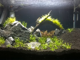 Und wenn eh schon alles nach Versuch aussieht, dann testen wir gleichzeitig mal das Tropica Soil. Aufgrund des Bodenfilters in der groben Variante. Also Soil rein, noch etwas am Hardscape feilen, Pflanzen verarbeiten und dann feststellen, dass es wohl eine Portion zu wenig war... X/