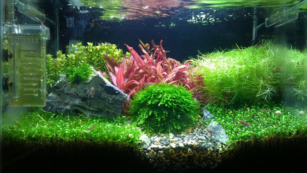 An der Technik habe ich nichts verändert. Es läuft noch immer ein Aquael Kopf auf einem Bodenfilter. Traumhafte Kombi. Komplett wartungsfrei! Die Wasserwerte bleiben komplett stabil. 4° dKH, 9° dGH. Der pH-Wert ist zuletzt langsam auf jetzt 6.9 gestiegen. Der Soil scheint seine Wirkung zu verlieren. Dem kann ich aktuell aber durch sanftes Erhöhen der CO2 Zufuhr entgegenwirken. Dünger habe ich auf JBL umgestellt. Jede Woche werden nach 50% Wasserwechsel 3ml Nitrat, 3ml Phosphat und 4 ml FE Micro gedüngt. Die entsprechenden Werte habe ich zuletzt Anfang Januar gemessen. Einzig GH, KH und NO2 messe ich wöchentlich vor dem Wasserwechsel.