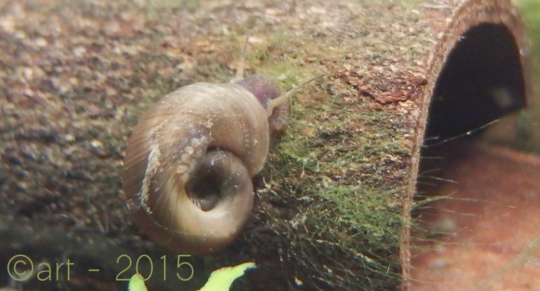 Nicht rosa, blau, rot oder bunt, schlicht Tümpelbraun, aus einem Seerosenbottich gefischt: höchstwahrscheinlich eine eingeschleppte Posthornschnecke.