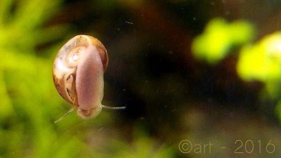 Nicht rosa, blau, rot oder bunt, schlicht Tümpelbraun, aus einem Seerosenbottich gefischt: höchstwahrscheinlich eine eingeschleppte Posthornschnecke.