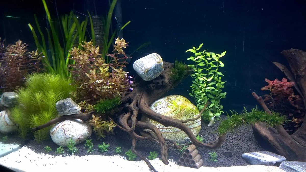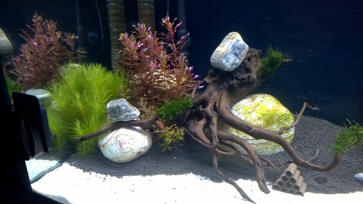 Garnelen habe ich noch keine drin, weil mir der "Urwald" auf der linken Seite noch nicht dicht genug ist und ich mich einfach immer noch nicht entscheiden konnte, welchen es denn werden sollen. Zur Auswahl stehen immer noch Amanos, Macrobrachium oder meine Red Fire. Mal schauen was sich in den nächsten Wochen tut.