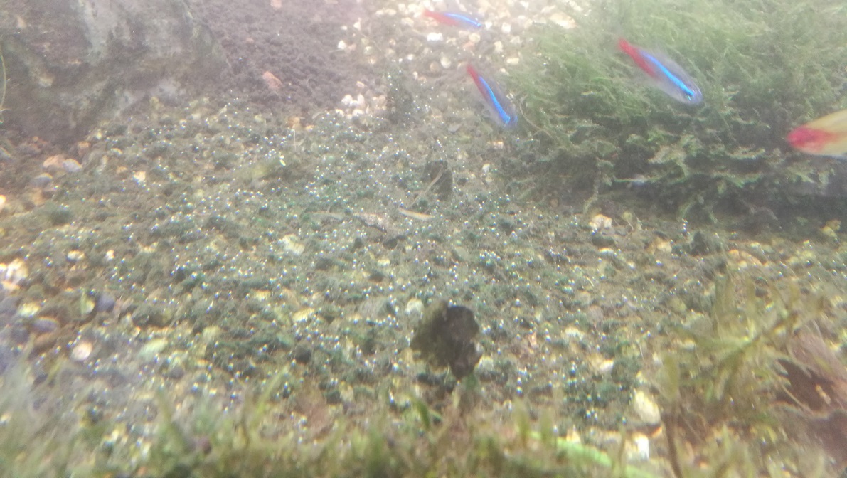 Die schlechte Nachricht - und ich denke man kann es ganz gut erkennen - auf den gestern eingebrachten Steinen bilden sich schon heute neue Algen. Auf den ersten Blick würde ich auf Cyanos tippen.