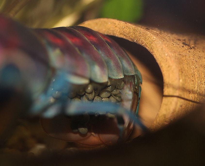 Wenn das Weibchen trägt, sieht man trotz eingerolltem Pleon an der Seite immer ein paar Eier.