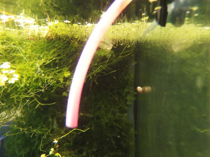 • Seit heute hab ich Nachwuchs - entdeckt! Noch weiden sie an der Seitenscheibe was auch immer ab ... meine mini-Hydren verdammt nah ... und ich fürchte die Alttiere setzen ihnen nach. Da die allerdings noch nicht mal einen trägen Microwurm richtig anpeilen können, hoffe ich, dass einige im Moos oder im Lomariopsis durchkommen. Die Utricularien-Reusen sind zu klein ... hoffe ich mal.
