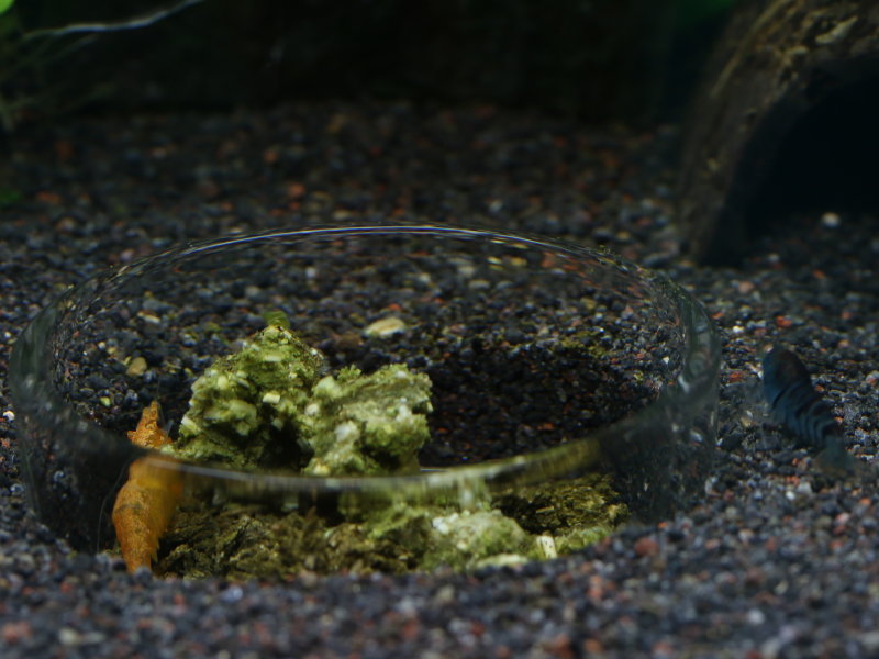 Es liegt immer ein Walnussblatt mit drinne, das von den Welsen zerlutscht wird. Für die Oto's zermörser ich immer die Welstabs, die meine großen Welse im anderen großen Aquarium bekommen. An dieses Futter gehen die Garnelen viel lieber als an die Sticks. Selbst das spezielle Shrimps Natural Futter kommt nicht all zu gut bei den Garnelen an.