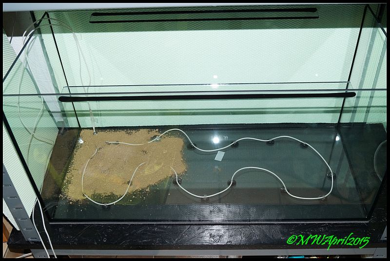 Dann lege ich die Bodenheizung in unregelmäßigen, aber geplanten Linien dort wo k e i n e Pflanzen hinkommen. Das Wasser steigt im freien Bodenbereich auf und geht um die Pflanzen herum in den Boden hinein (Genau umgekehrt der Bodenheizungswerbung). So werden die düngetauglichen Abstoffe sofort zu den Pflanzen geleitet und nicht irgendwo hin. Und Pflanzen mögen k e i n e warmen Füße. So hab ich Wasserumwälzung im Boden ohne Wärme an den Wurzeln. Ich hatte mal die Hälfte an der Rückwand entlang mit Heizschlange und die Hälfte ohne, habe nachträglich an der ganzen Rückwand entlang gepflanzt und da wo die Heizschlange war, sind die Vallisneria tortifolia stark gekümmert. Die Bodenheizung hängt mit kleinem Doppelstecker mit dem Licht an der Lichtzeitschaltuhr, weil die Pflanzen nur mit Licht arbeiten, sonst brauchen sie keinen Dünger. Im Sommer wenn es ganz heftig warm wird läuft die Bodenheizung für den Düngewassertransport im Boden nur 2 - 4 x tägl. eine 1/4 Std. extra geschaltet.