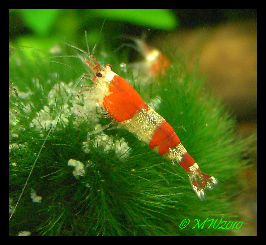 Nachdem das Becken eingelaufen war und alle Garnelen eingezogen sind war anfangs alles gut. Die Kerlchen machen einen munteren Eindruck, fraßen, wuchsen und waren viel unterwegs. Optisch machten sie auch einen gesunden Eindruck.