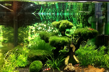 Das Becken: 20 Liter, Schwammfilter, schwarzer Garnelenkies, Moosball und ein damit bestücktes Bäumchen und ein Lavastein,