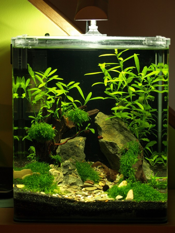 Seit Janauar hab ich mir, nach fast einem Jahr rumüberlegen, ein Nanoaquarium zugelegt. Das Becken lieft gut ein. Alle Pflanzen, außer die