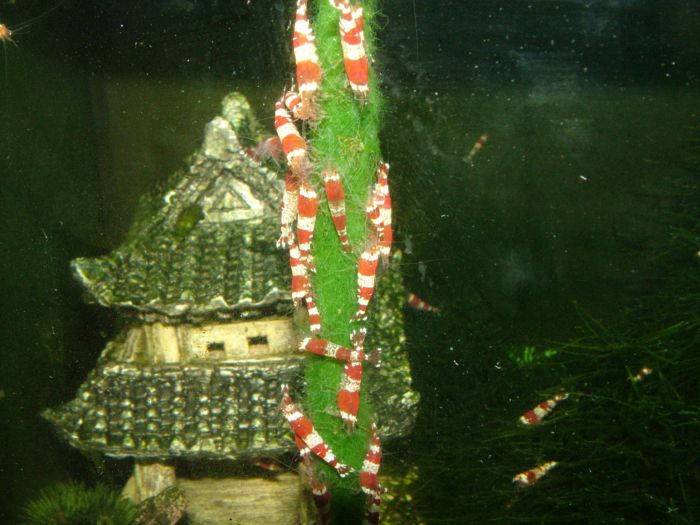 Jetzt hab ich mich entschlossen, die Algen nicht einfach auf den Boden zu versenken. Vielmehr habe ich die Algen am Futterring aufgehängt. Da muss die Bande wenigstens ein wenig klettern und Präsenz zeigen.