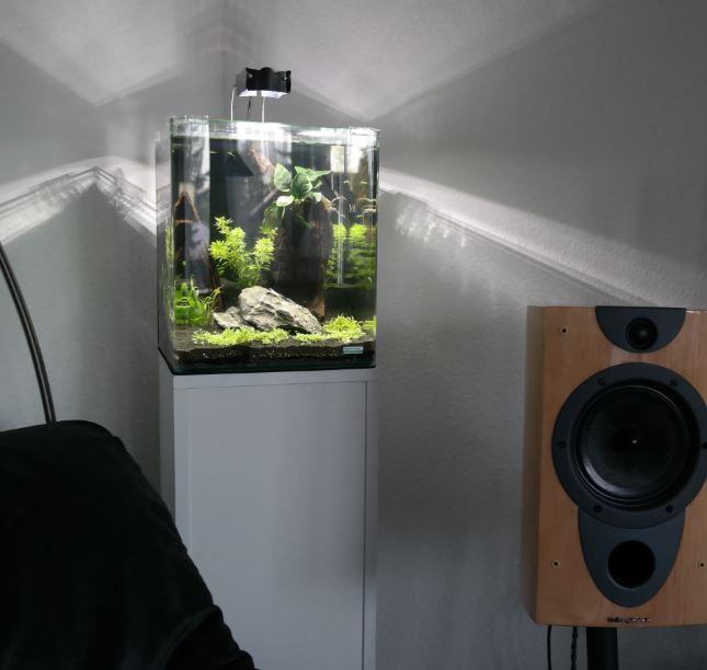 Eingericht wurde es irgendwann im Januar. Als Bodengrund habe ich diesmal Soil genommen und darauf schwarzen Garnelenkies platziert. Pflanzen wurden aus dem Nano Cube entnommen, denn dran herrscht dort mittlerweile auch überfluss. Den Dennerle Eckfilter mitsamt der Erweiterung nutze ich nun in dem Aquael Becken. Ferner habe ich anfänglich immer einen Teil des Tauschwassers aus dem Cube in das Aquael Becken transferiert.