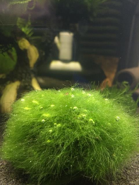 Auf der Mooskugel sitzt eine kleine Babygarnele, die anscheinend erst wenige Tage jung ist