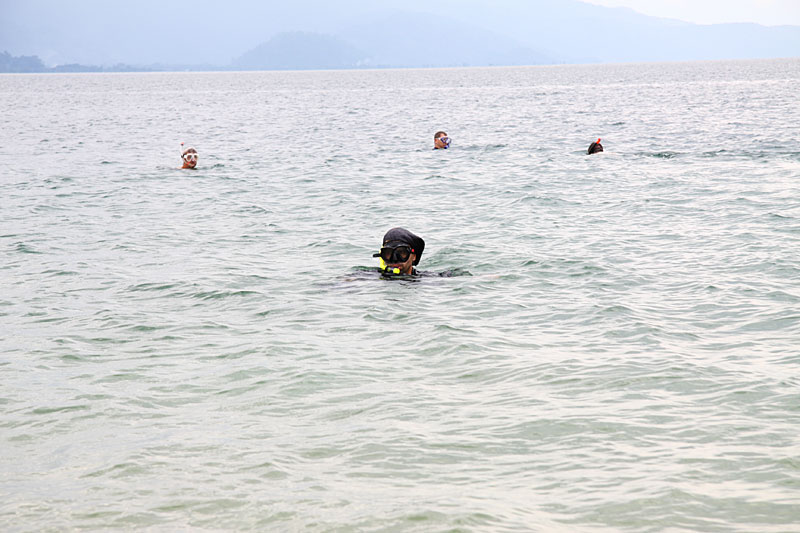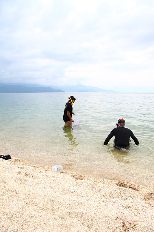 Also nicht lange gefackelt und nachdem die Austrüstung und Taschen im Bungalow gelandet waren, gings ab ins Wasser. Sand/Kiesstrand und einige Holzfeiler des angrenzendes Steges machten nicht allzuviel Hoffnung, aber zwischen den Holzbalcken dann doch einiges an Blaufußgarnelen (Caridina caerulea), Caridina ensifera, Caridina longidigita, Tylos und einigen Grundeln und Krabben. Mi 28° C war das Wasser herrlich warm und gefangene Tiere wurden nach Begutachtung wieder entlassen. Die Wasserwerte wurden natürlich ebenfalls noch am Nachmittag bestimmt, bevor es dann zum schon erwähnten Essen direkt am See ging... kaum zu toppen. ;o)