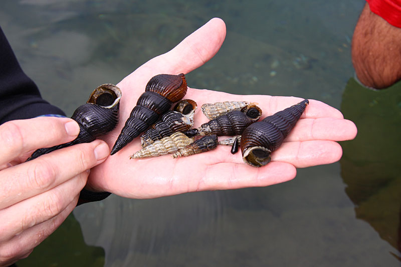 Wir sind aber alle heil durchgekommen und kamen nach ca. 20 min. in den Mahalona-See. Der begann mit einem weitläufigem Flachwasserbereich und wir hielten auch sofort an und sprangen ins Wasser. Schöne Ottelien und Sulawesigräser waren zu sehen, wie auch sehr viele, schöne verschiedene Tylomelania-Arten, die fast alle nur im Mahalona-See vorkommen, wie z.B. Tylomelania inconspicua, die nur auf Ottelien lebt.