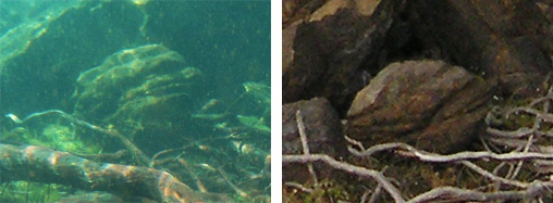 Wo wir 2008 trocknen Fusses umherspazieren konnten, mussten wir dieses Jahr in gut 1,20 m tiefem Wasser schnorcheln... Jetzt vor Ort waren wir uns nicht ganz sicher, ob es die gleiche Stelle von 2008 war, aber sie es definitiv... Was für ein Zufall, die gleichen Mangrovenwurzeln zu fotografieren... vielleicht sollte ich schnell noch Lotto spielen.