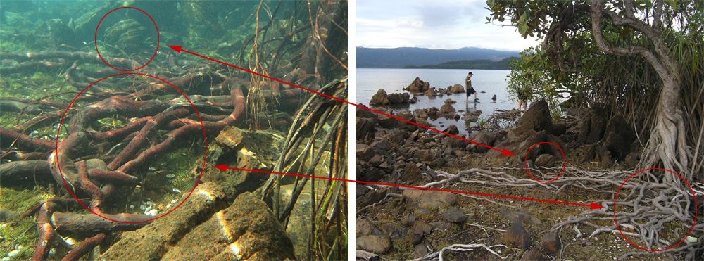 Wo wir 2008 trocknen Fusses umherspazieren konnten, mussten wir dieses Jahr in gut 1,20 m tiefem Wasser schnorcheln... Jetzt vor Ort waren wir uns nicht ganz sicher, ob es die gleiche Stelle von 2008 war, aber sie es definitiv... Was für ein Zufall, die gleichen Mangrovenwurzeln zu fotografieren... vielleicht sollte ich schnell noch Lotto spielen.