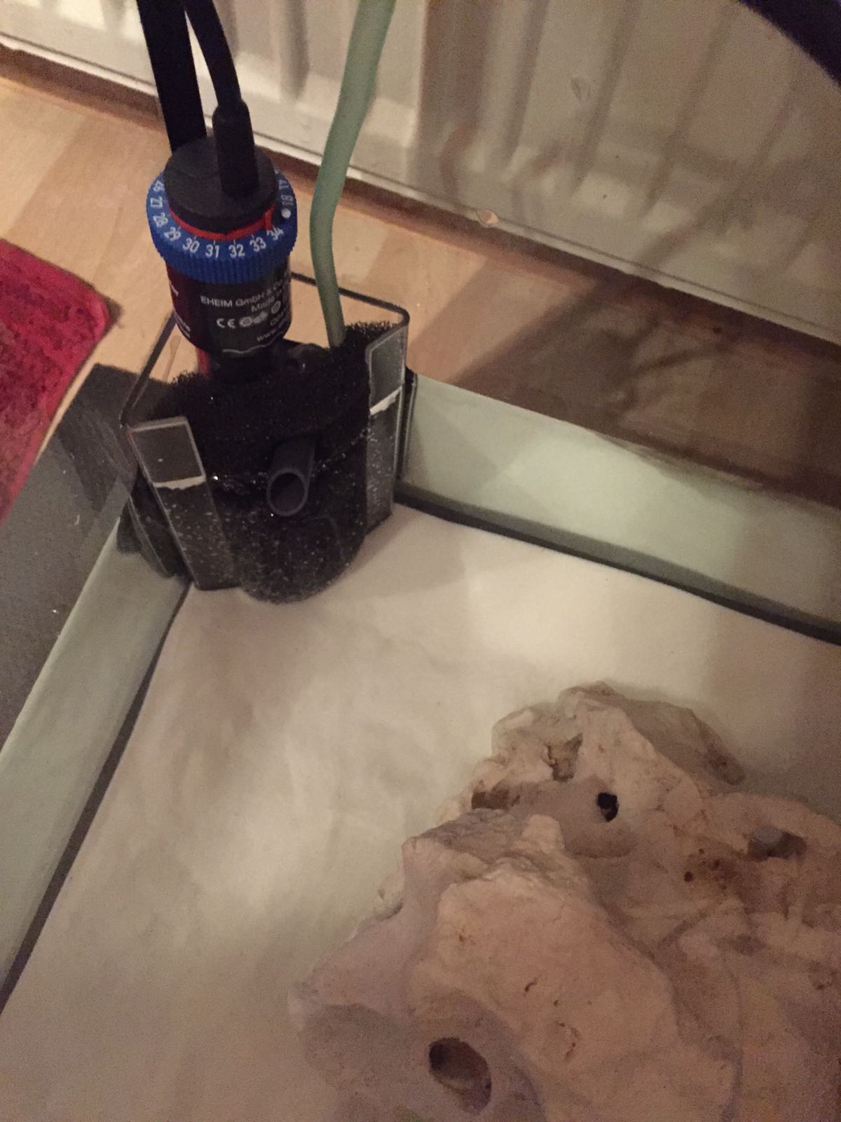Aber ich sehen noch ein anderes Problem. Dein HMF ist zu klein wenn due die Heizung dahinter verstecken willst. Der Stab berührt die Filtermatte, was nicht gut ist. Zum einen wird dadurch der Durchfluss durch die Matte behindert und die Filterleistung reduziert. Zum Anderen kann die Heizung dort ihre Wärme nicht abgeben. Die Heizstäbe werden SEHR heiß wenn die nicht permanent von Wasser umspült werden und ihre Wärme abgeben können. Dort wo der Stab die Filtermatte berührt kann sie ihre Wärme nicht richtig abgeben, was leicht zur Überhitzung und damit zum Springen das Glases führen kann.