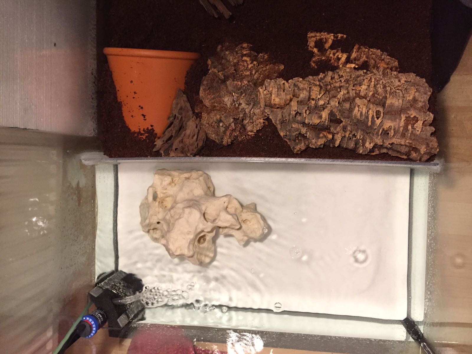 Die Temperatur beträgt nun im hinteren Teil des Terras (bei der Korkhöhle) zwischen 20-21°. Im vorderen Teil (also beim Wasserteil) 20° und die Wassertemperatur selbst beträgt 18°. Die Luftfeuchtigkeit ist mit zwischen 75-90° meiner Meinung nach okay.