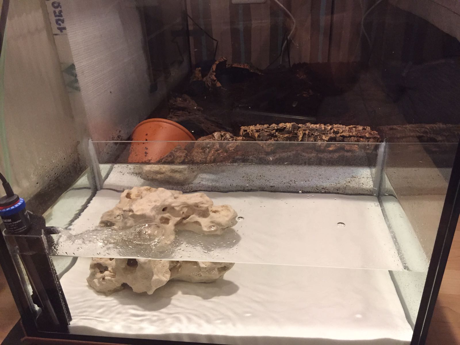 • Soo, nun war ich leider enorm in die Arbeit eingespannt und konnte mich mehrere Tage um nichts wirklich kümmern, nun habe ich folgendes gemacht: Ich habe erstmal den kompletten Wasserteil herausgenommen da die Wurzel anfing zu schimmeln und das Wasser sich orange färbte. Nun habe ich also alles entfernt, den Bodengrund nochmals komplett durchgewaschen, das Wasser komplett ausgewechselt, bevor ich Sand und Wasser wieder eingefüllt habe, habe ich mit Wasser und Essigessenz durchgeputzt. Stein und Filter heiß abgespült. Nun sieht wieder alles aus wie vorher nur ohne die Wurzel, die ist nach einer längeren Zeit im Backofen auf den Landteil gezogen. Einen ausstieg werde ich mir dann eher aus Stein o.ä. zusammenbasteln. Hättet ihr dafür noch Ideen? Einfach Steine schichten? Steine per AQ-Silikon kleben? Ein Gebilde aus Ton? Bin für Vorschläge offen :)