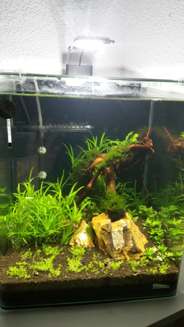 Das Becken ist ein D****le Nano Cube 30 l, gekauft im Set mit Led Lampe, Filter und anderem Zubehör, das ich noch auf Lager liegen habe. Als Bodengrund habe ich den Environment Soil als Powder drin, sowie versteinertes Holz, eine kleine Moorkienwurzel und natürlich Pflanzen, die da wären Hcc, Javamoos, Staurogyne Repens, Hetherna Zestorifolia und Beucelphandra wavy leafs....gott für die Pflanzennamen übernehme ich keine Garantie.