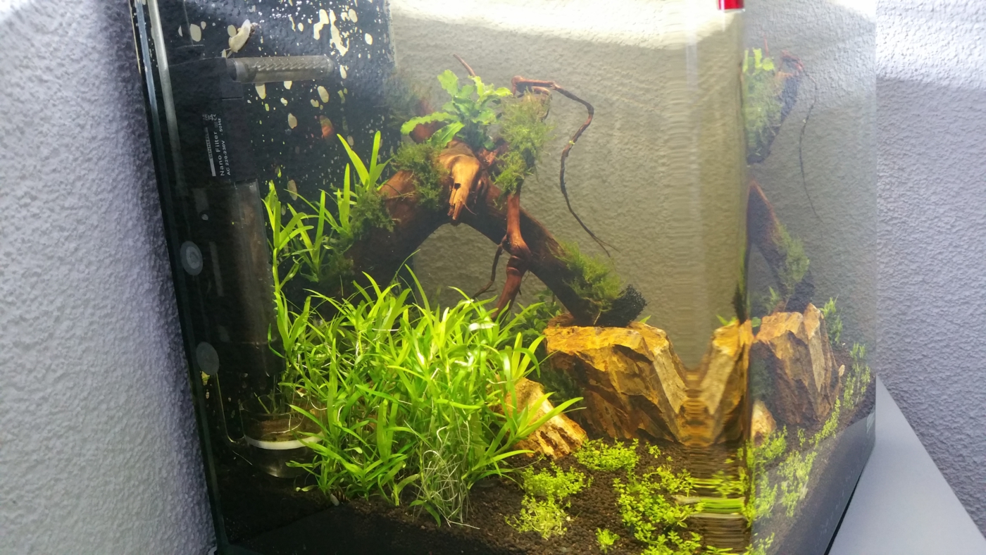 Das Becken ist ein D****le Nano Cube 30 l, gekauft im Set mit Led Lampe, Filter und anderem Zubehör, das ich noch auf Lager liegen habe. Als Bodengrund habe ich den Environment Soil als Powder drin, sowie versteinertes Holz, eine kleine Moorkienwurzel und natürlich Pflanzen, die da wären Hcc, Javamoos, Staurogyne Repens, Hetherna Zestorifolia und Beucelphandra wavy leafs....gott für die Pflanzennamen übernehme ich keine Garantie.