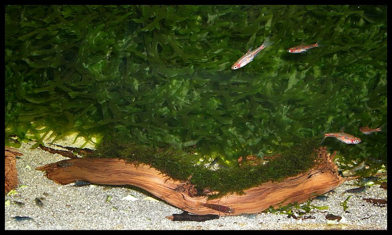 Dieser Pflanzenpuschel ist ein begehrter Platz für meinen Garnelennachwuchs. Ein ideales Versteck und die Blätter bieten genügend Oberfläche zum Abweiden. Wer genau hinguckt, findet zwei kleine Saubermacher, die meinem blauen Tigerstamm entsprungen sind