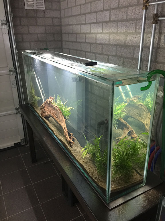 Hier mal ein längliches Becken. War von meinem Aquariumbauer für jemanden als Schaufensterbecken gedacht, hat aber dann über Umwege den Weg in meinen Keller gefunden.